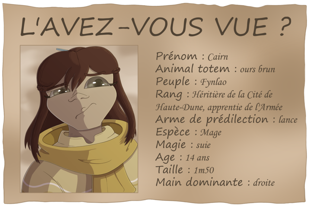 Cairn n’a connu dans sa vie que l’Armée et le combat, ayant été placée là-bas par son père dès ses huit ans. Il jugeait en effet que sa place en tant que future Dirigeante – et donc chef des Armées – l’imposait de s’imprégner au plus tôt de ce monde brutal. Cairn n’a jamais eu son mot à dire à propos de son avenir. Bien qu’elle soit très douée en stratégie et à la lance, son arme de prédilection, elle n’a que faire de l’administratif. Élevée en majorité par son père et d’une main de fer, elle n’ose pas se confronter à lui. Il la terrifie.